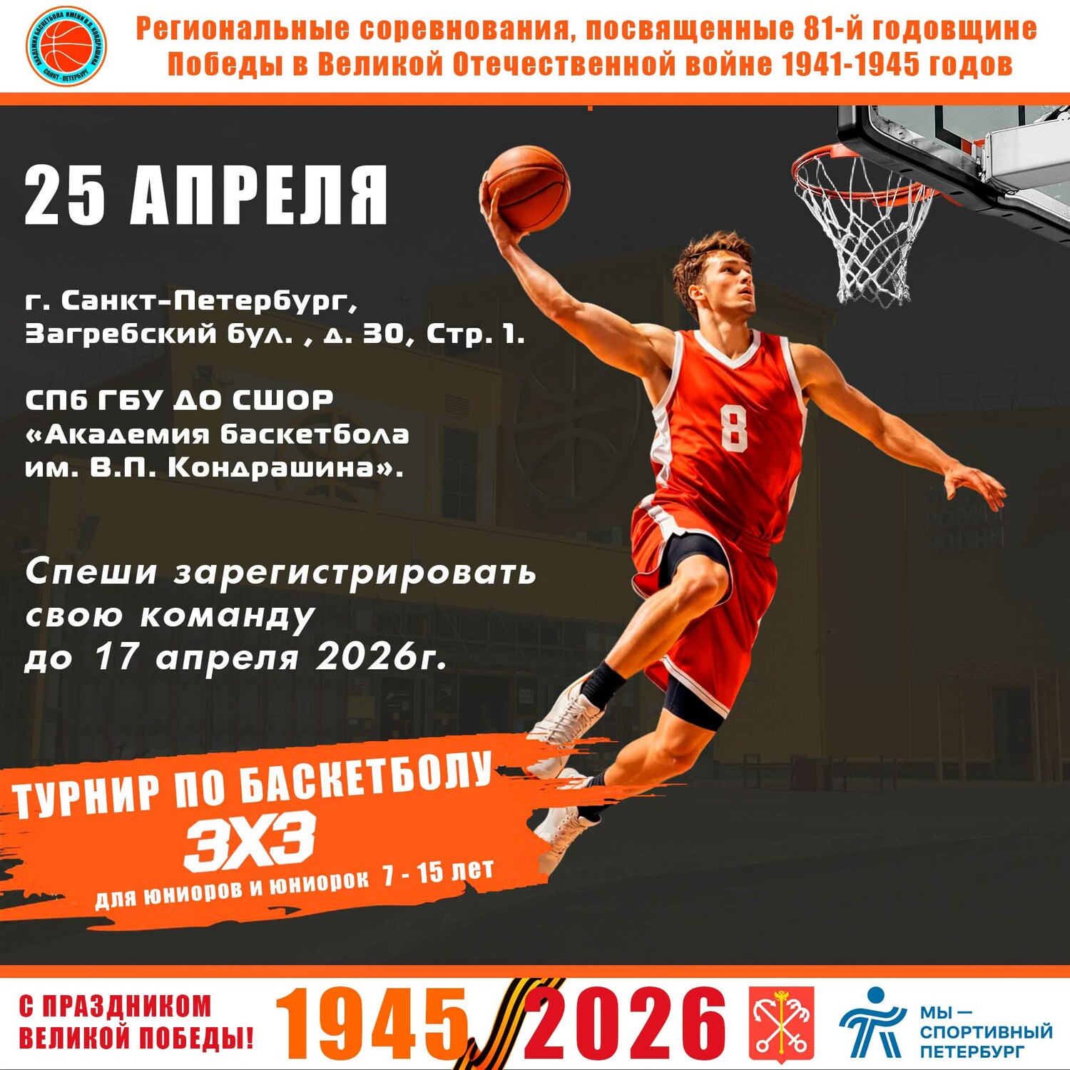 В честь 81-й годовщины Победы в Великой Отечественной войне 1941–1945 годов приглашаем команды принять участие в региональных соревнованиях по баскетболу (дисциплина 3х3)!