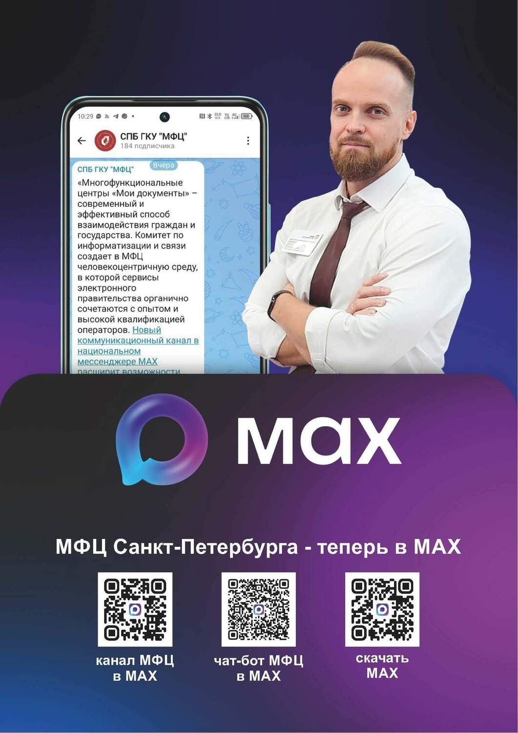 Жители Санкт‑Петербурга могут получить доступ к услугам МФЦ через национальный мессенджер MAX. Для этого запущены два цифровых сервиса: официальный канал МФЦ в MAX;чат‑бот МФЦ в MAX.