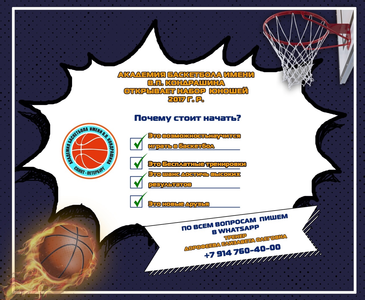 Академия баскетбола открывает набор в спортивно-оздоровительную группу юношей 2017 г.р. Записаться на просмотр можно через администратора Академии по номеру телефона